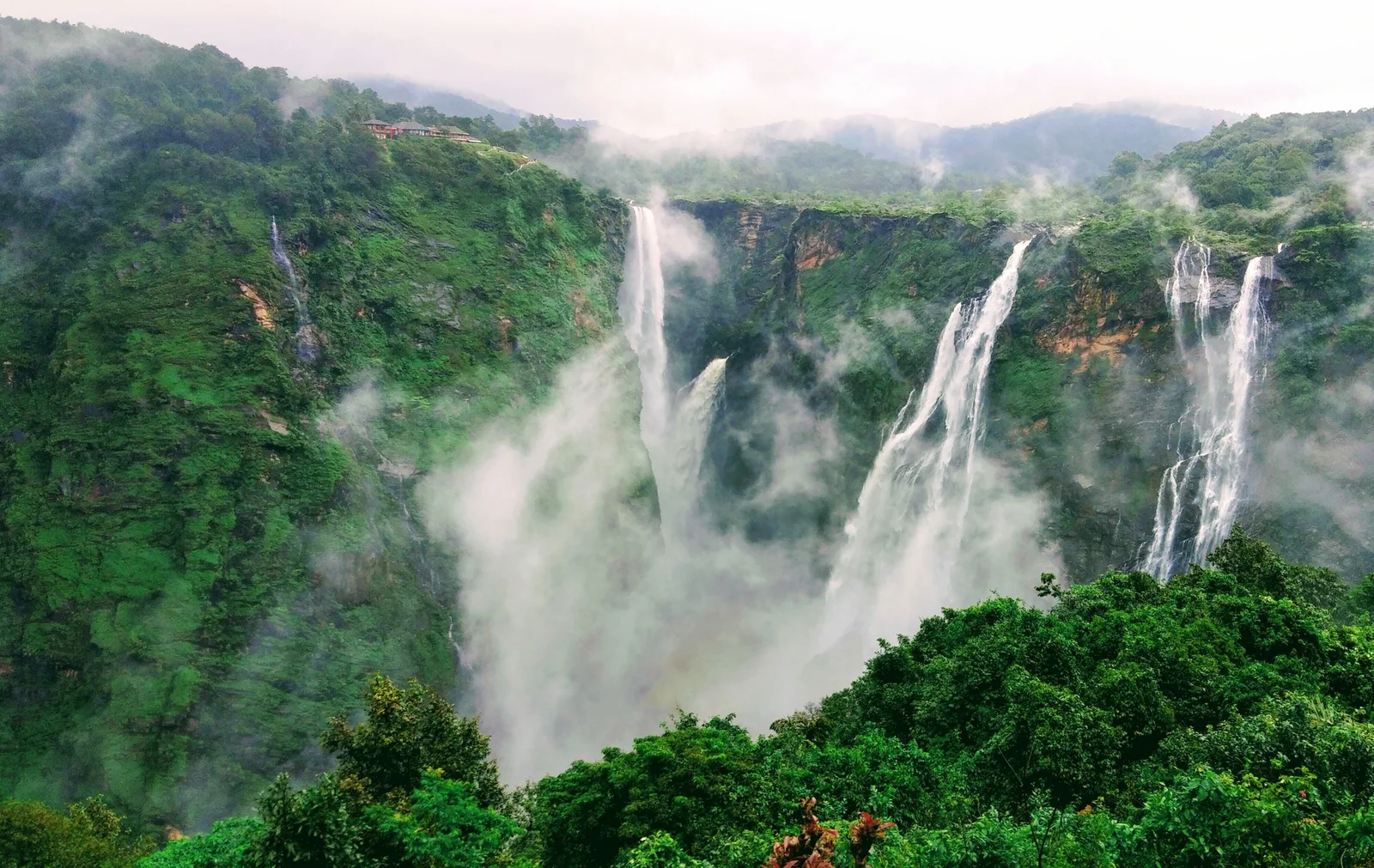 Marvel at the majestic Jog Falls, one of India’s highest waterfalls, where water cascades from dramatic heights into the rocky valley below.